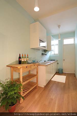 廚房也用了和書房同樣的牆面顏色與地坪元素做連結,再搭配鄉村風的系統廚櫃,構成了完美的開放式廚房。